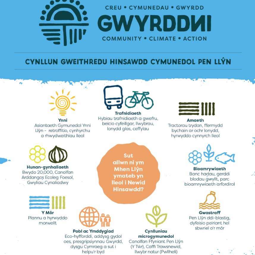 Yn 2022 a 2023, cynhaliwyd cyfrys o Gynulliadau Cymunedol ar yr Hinsawdd mewn pum rhan o ogledd orllewin Gwynedd i ateb y cwestiwn: Sut allwn ni yn (yr ardal hon) ymateb yn lleol i Newid Hinsawdd?