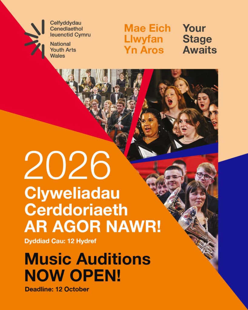 Mae clyweliadau ar agor yn swyddogol ar gyfer Band Pres, Côr a Gerddorfa Genedlaethol Ieuenctid Cymru 2026. Gwnewch gais nawr am eich cyfle i berfformio ochr yn ochr â cherddorion ifanc gorau Cymru!