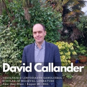 Mae David Callander yn ysgolhaig llenyddol ac arbenigwr ar y canol oesoedd, yn arbenigo mewn barddoniaeth gynnar Gymraeg a llenyddiaeth Gymraeg ganoloesol. Mae ei ymchwil yn gymharol ei natur ac yn archwilio’r hyn y gellir ei ddysgu drwy ddod â thraddodiadau llenyddol cyfoes ond amrywiol ynghyd, gan gymharu testunau Cymraeg Canol, Hen Saesneg, Saesneg Canol, a Lladin ganoloesol. Mae hefyd yn cynnal ymchwil gymharol rhwng testunau Lladin a’r ieithoedd Celtaidd eraill. Ymhlith ei ddiddordebau eraill mae archwilio sut y gall damcaniaeth lenyddol fodern a llenyddiaeth ganoloesol oleuo ei gilydd, ac astudio sut mae testunau canoloesol wedi cael eu trawsffurfio ar ôl y cyfnod canoloesol. Dyma oedd ffocws ei lyfr diweddaraf Trawsffurfio’r Seintiau (Gwasg Prifysgol Cymru, 2024), sy’n seiliedig ar yr antholeg hagiograffaidd dairieithog Yale, Osborn fb229.